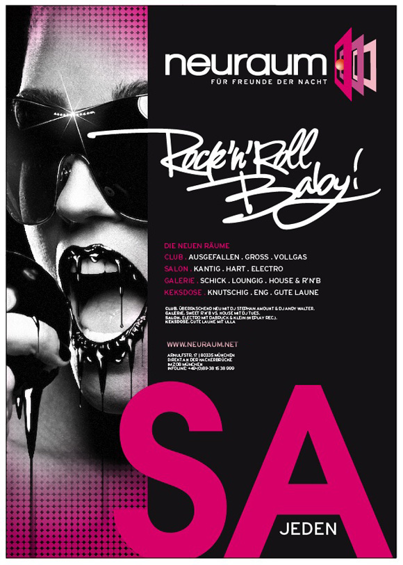 Jeden Samstag werden die Zutaten für eine unvergessliche Nacht ganz nach dem Motto "Rock'n'Roll Baby" neu gemischt: vier Räume, heiße Beats, sexy Mädels und coole Jungs. Für musikalische Abwechslung sorgen die vier Areas: Vom Club, mit seinem wilden und ausgefallenen Sound, über den Salon mit kantig-hartem Electro bis hin zur Galerie, wo dich selected R'n'B erwartet, sorgt zu guter Letzt die knutschig-kuschelige Keksdose für eine legendäre Party. Let's rock… im neuraum.